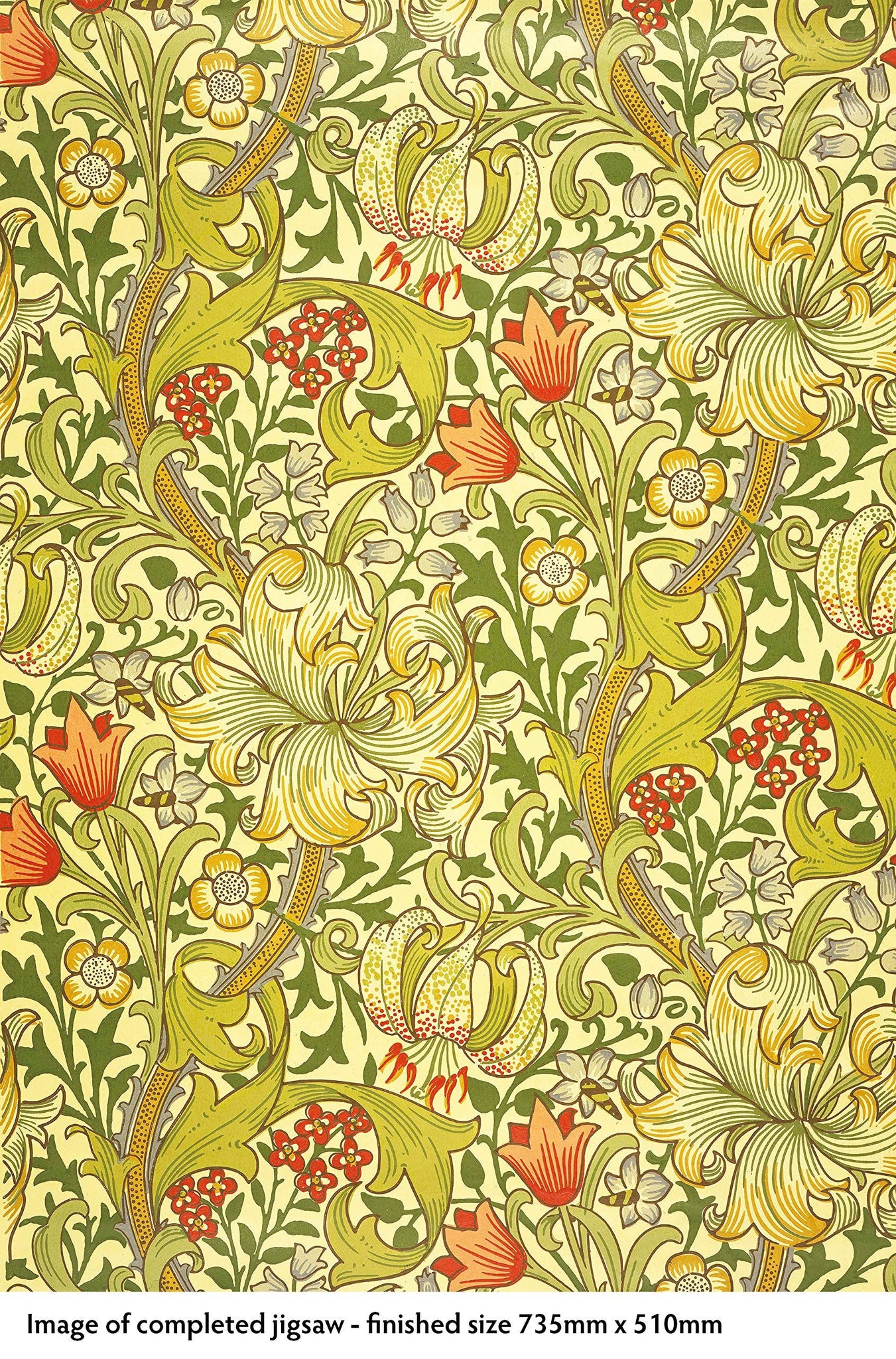 A sturdy, square-box 1000-piece jigsaw puzzle featuring a charming, intricate William Morris Gallery: Golden Lily design. Suitable for adults and children over 13 years, the finished puzzle size is 735 x 510mm.